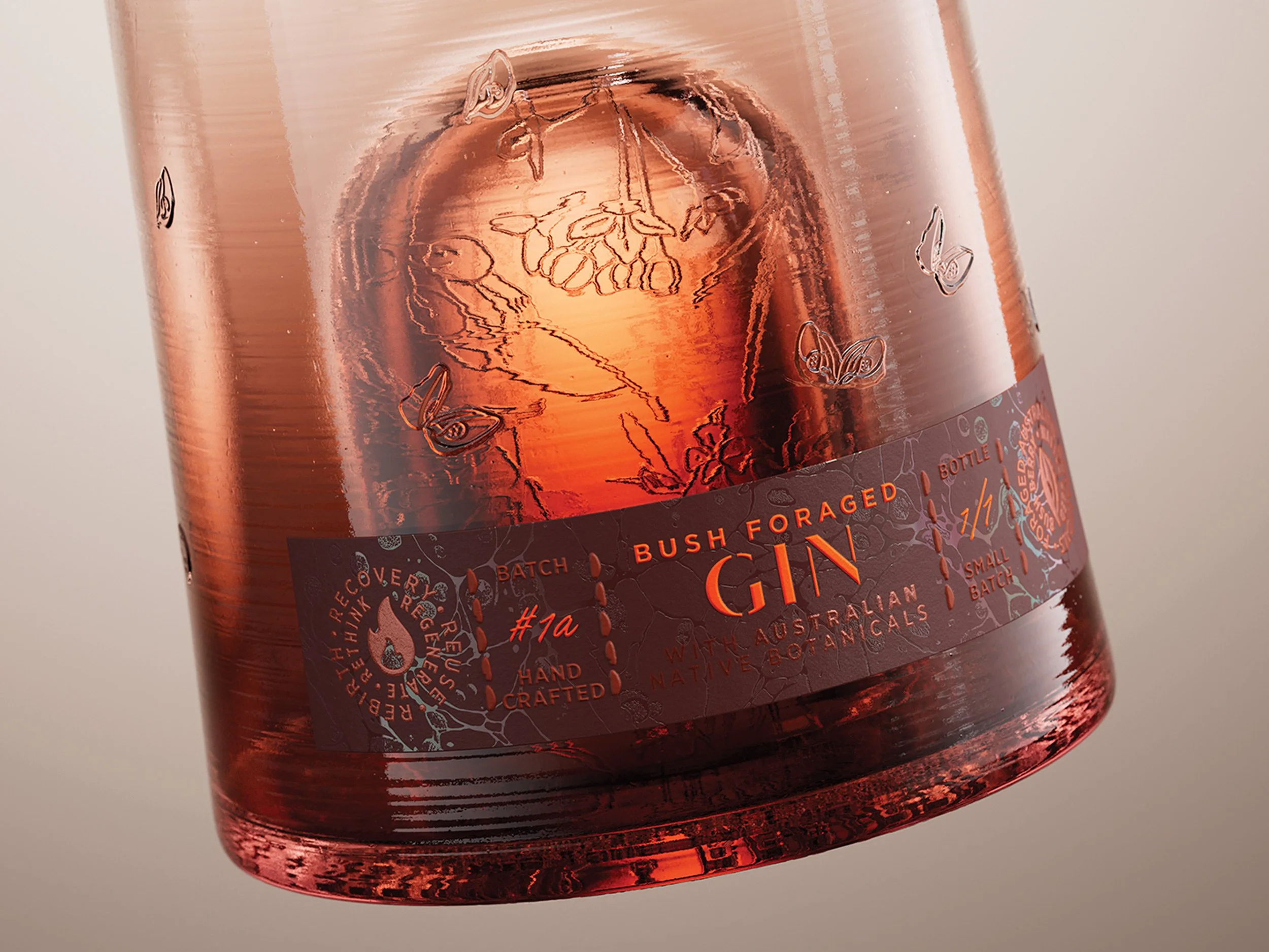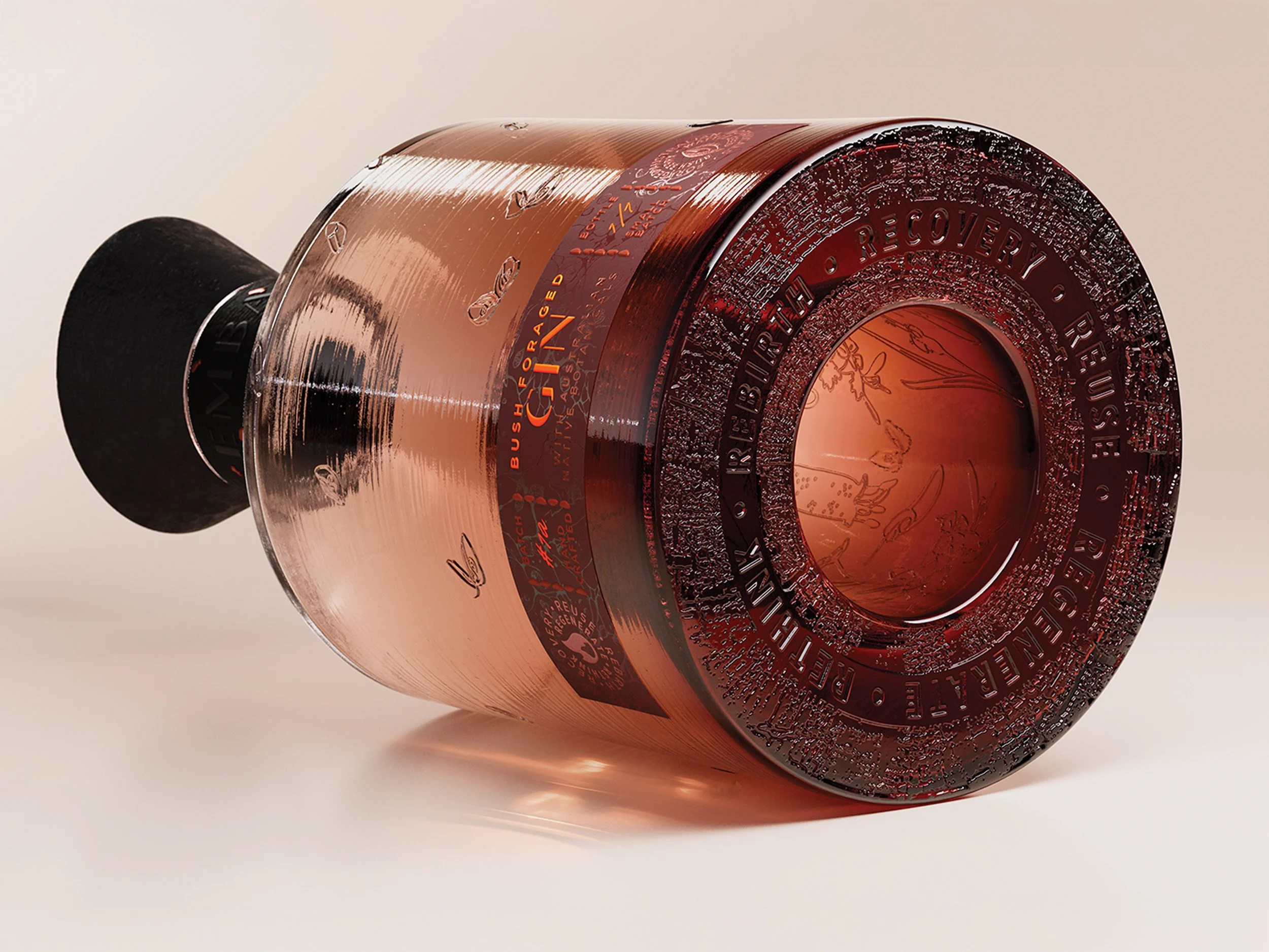 The charred wood closure holds the brand’s message, also etched into the bottle’s base: recovery, reuse, regenerate, rethink, rebirth. A mantra of renewal whispered through every detail.